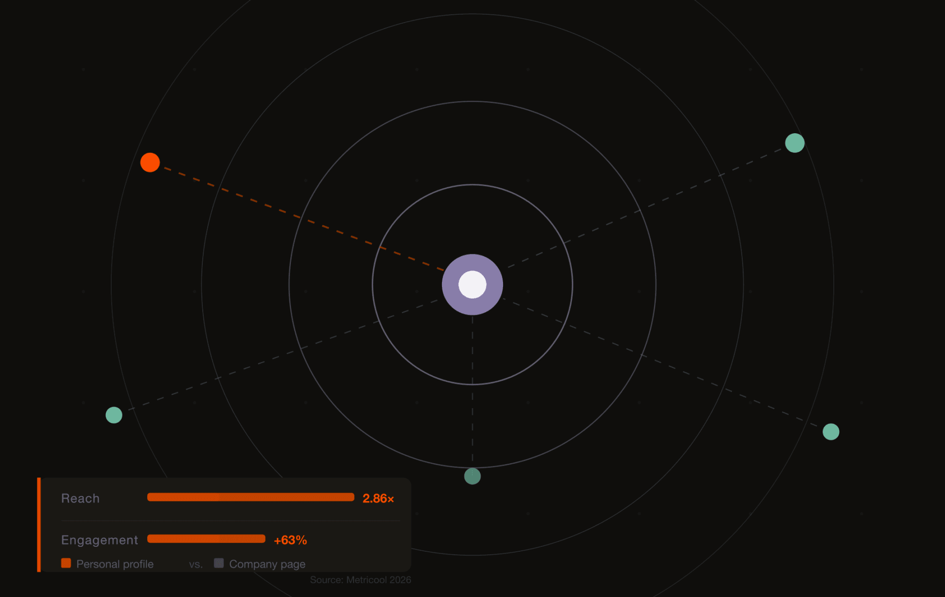 LinkedIn is therefore not a distribution channel but a trust infrastructure. Decision-makers follow individuals rather than company pages, because individuals hold a point of view whilst company pages tend to publish announcements and promotional copy. Data from a recent Metricool study confirms that personal profiles achieve a 63% higher engagement rate than company pages at nearly equivalent reach.2 Anyone who is not visible or who appears poorly positioned at the moment someone is quietly researching has already lost the race without knowing it.