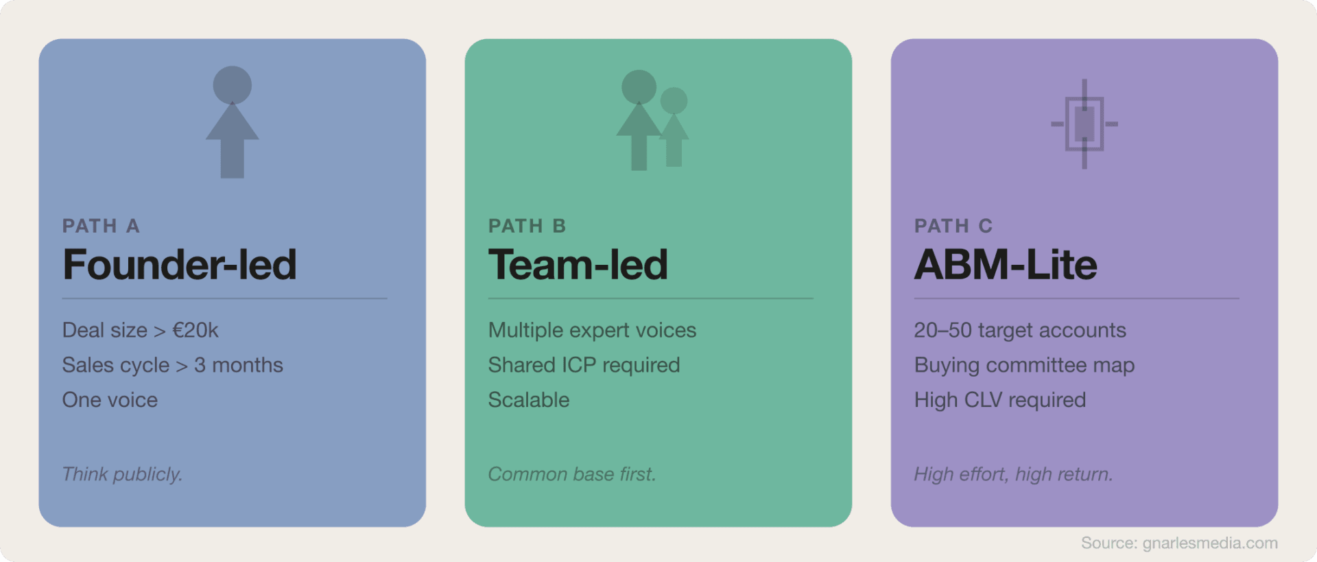 You as a founder are the differentiating factor. Your perspective, your mistakes, your assessments become the reason someone wants to speak with you and not someone else. This path works well for consultancy-intensive solutions, deal sizes above 20.000€, and sales cycles of more than three months. One prerequisite: you must be willing and able to think in public.