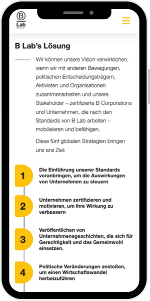 As part of a broader European collaboration with B Lab Benelux and B Lab Italy, B Lab Germany was preparing to launch a new website aimed at growing the B Corp community in Germany. Their wish was for a website that would help businesses take the first step towards certification with more clarity and less complexity.
