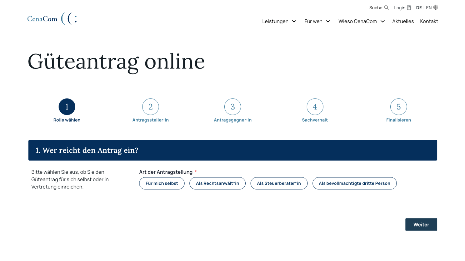 CenaCom needed a modern website that communicates expertise and gives businesses fast access to the right information. In addition, the entire application process was to be fully digitised. Interested parties should be able to apply for a dispute resolution procedure (previously referred to as a conciliation procedure) completely online.